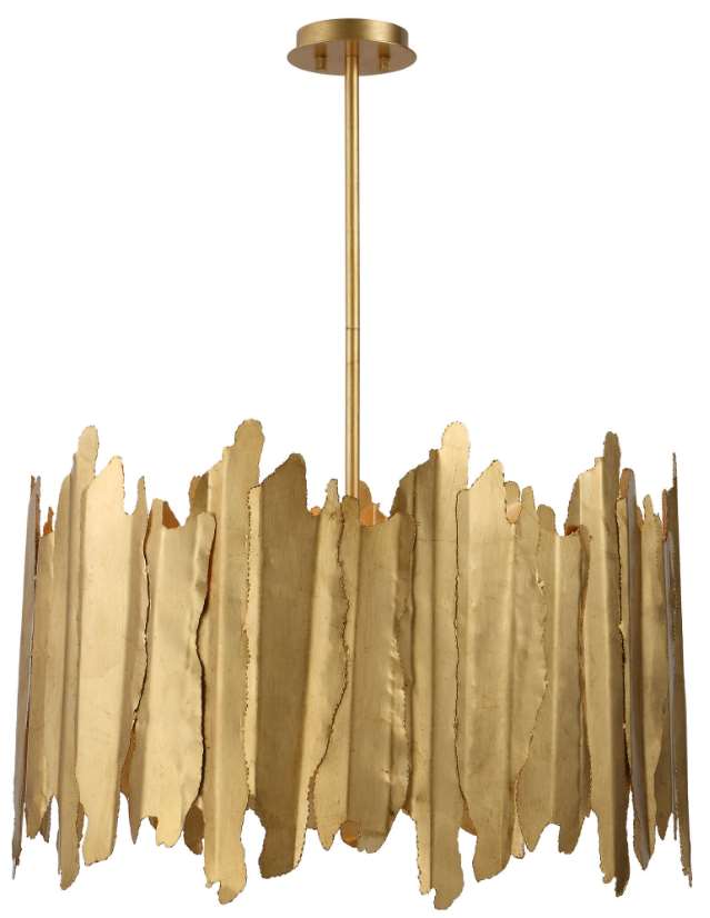 Industrial metal segment sheets welded with rough cut edges juxtaposed with a gold leaf finish give an elegant look to this chic pendant. Supplied with 15' wire, 3-12" stems, and 1-6" stem for adjustable installation with 8-60 watt max candelabra sockets.Read More