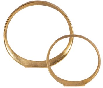 Set of two, textured cast aluminum ring sculptures feature a clean gold finish.Read More