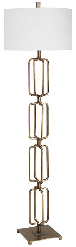 The Link floor lamp features a unique design made from hand forged iron, finished in a heavily antique brushed gold. The hardback drum shade is covered in a white linen fabric.Read More